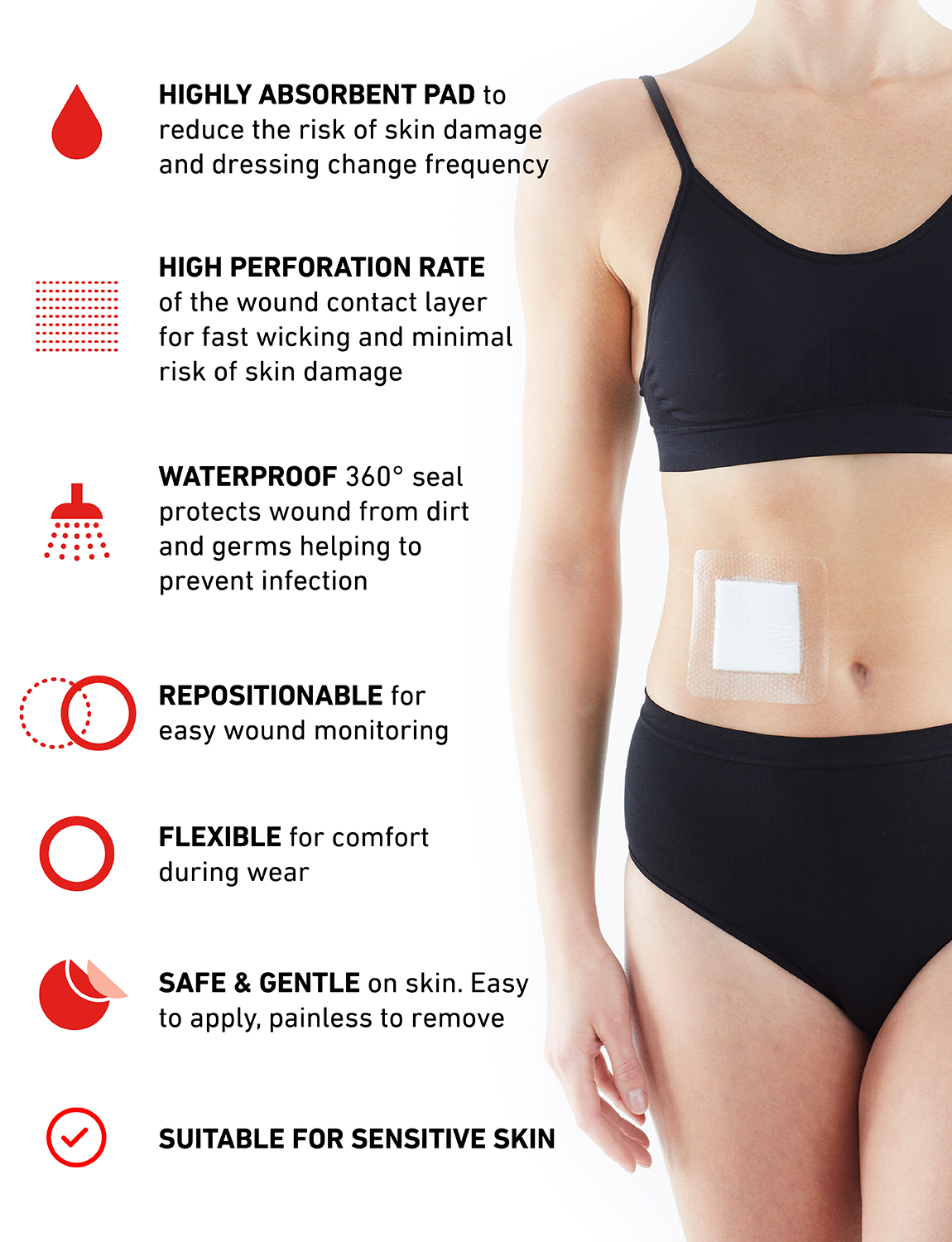 The 360° seal is showerproof and protects wound from dirt and germs, helping to prevent infection. Repositionable and flexible for easy wound monitoring & comfort during wear.